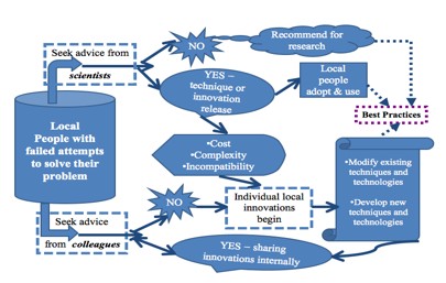 Seeking Advice from Colleague Farmers: Local farmers also have the option to seek advice from their colleagues. In the event of failure to address the problems, local farmers attempt to innovate by either modifying the expensive or complex techniques that they learn from the scientists to meet their needs or radically developing new approaches by themselves. Successful implementation of these innovations by the individual farmers results in the spread of the innovation among the communities.
